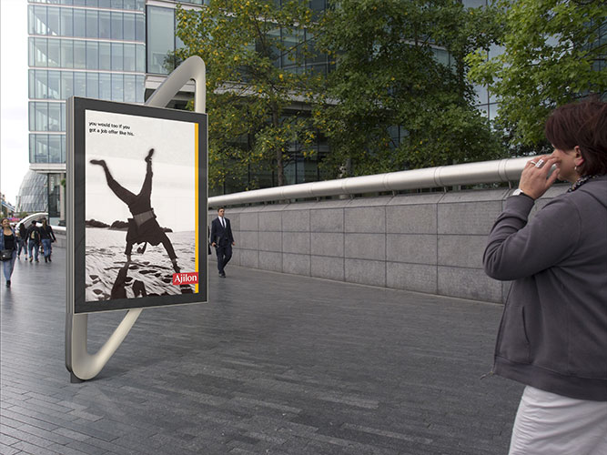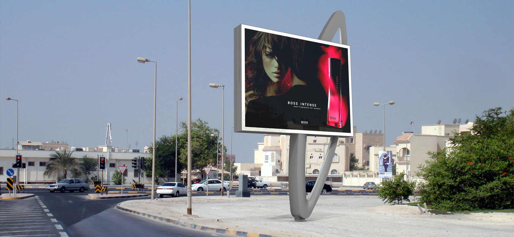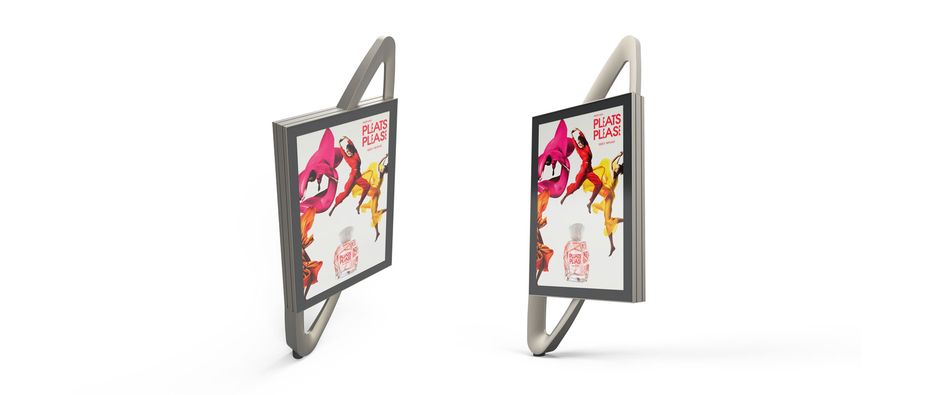 Concept of street furniture display developed in several formats, 2, 4, 6, 8 m2. Steel and aluminium structure, body in polyester, back lit, scrolling and LED screens First installed in Saudi Arabia the beginning of 2013. The game is to create, around a "poster" whose format is standardised, a sign both alive and strong. EYE plays with transparency and lightness.