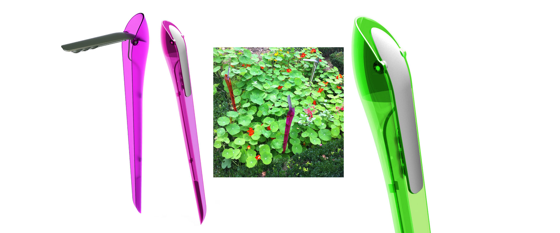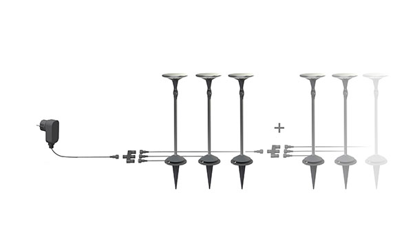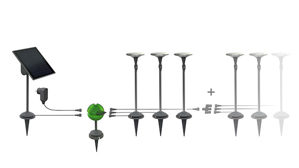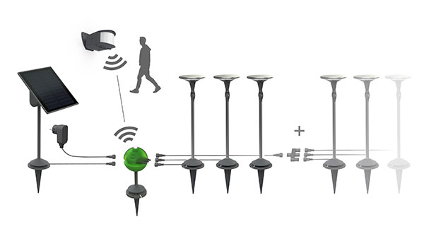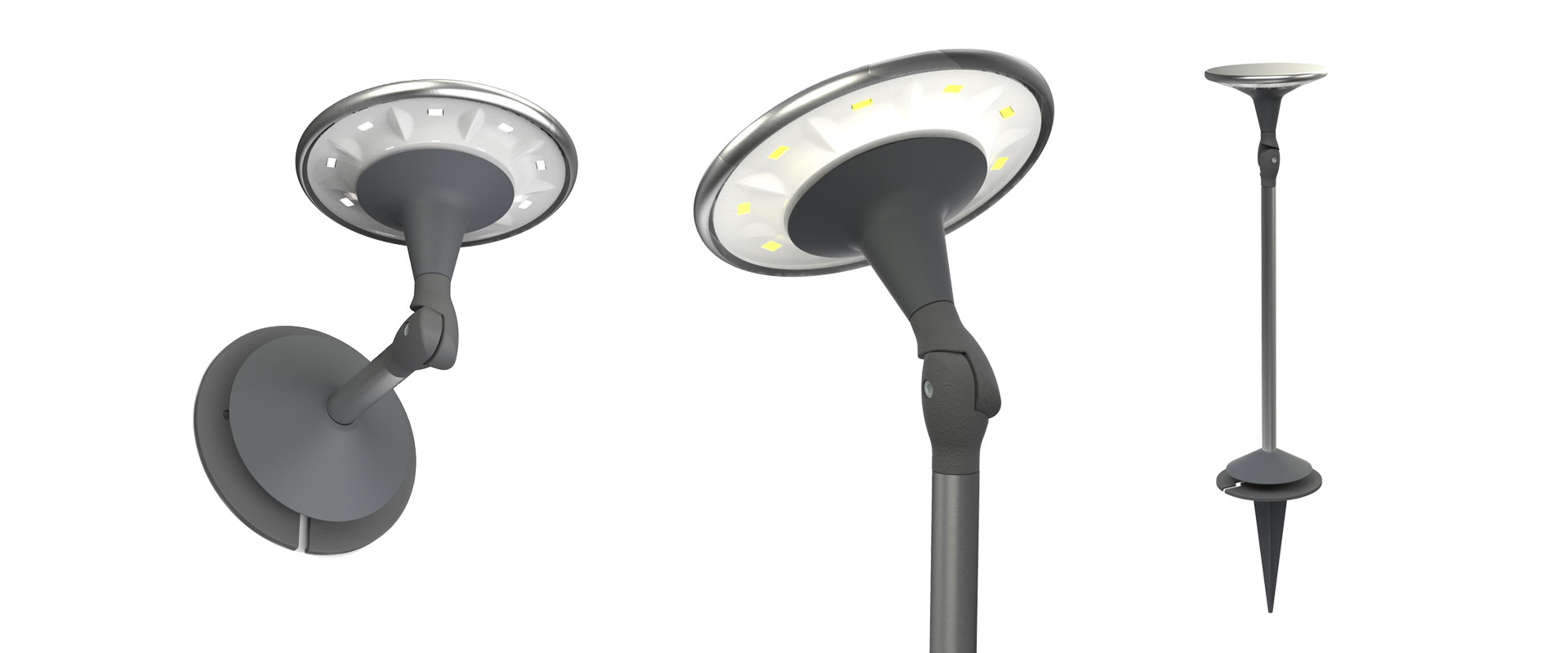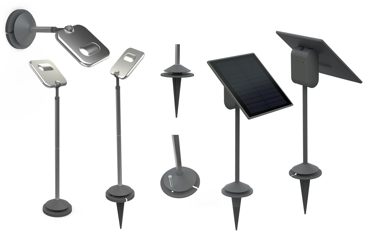 Sun’connec is a solar lighting range composed of several elements. These elements can be chosen and work together following the user’s choice. Originally, the question was to create a solar lamp with its own solar panel. In front of a solar market full of “cheap gadgets” the goal was to offer a real quality and functionality. The possibility to open the concept and to work on a more functional range quickly became apparent. Destined also for the north European markets with low levels of sunlight the hybrid concept was adopted. A battery was integrated in the solar panel and we imagined the Green Ball as the connection interface, switching between solar and mains power automatically. Dusk/dawn and motion sensors where added. Above all is the proposition of different light fixtures offering a choice in terms of use and taste. Picked, screwed, ground or wall, the range is really versatile.